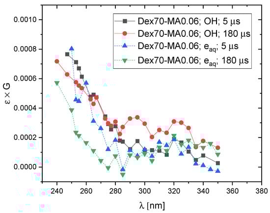 Pulse radiolysis allows not only for the study of kinetics but also observing in time-resolved mode the spectra of transient species formed upon irradiation. While a complete study of spectral properties and time evolution for various pulse-irradiated Dex and Dex-MA samples is beyond the scope of our work, we have recorded selected spectra of reaction intermediates to support the discussion of the first steps of reaction mechanisms (see Section 3).