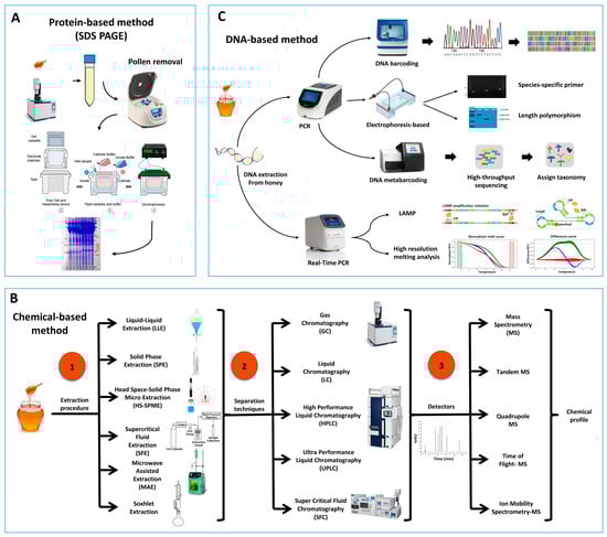 Figure 1. Schematic representation of the commonly used sample processing and techniques for the study of the entomological origin of honey. (A) Protein-based method, (B) Chemical-based methods emphasizing on different extraction methods, separation techniques, and Detection of identification of compounds, (C) DNA-based methods.