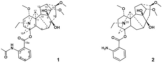 - Wang, J.-L.; Shen, X.-L.; Chen, Q.-H.; Qi, G.; Wang, W.; Wang, F.-P. Structure–analgesic activity relationship studies on the C18- and C19-diterpenoid alkaloids. Chem. Pharm. Bull. 2009, 57, 801–807. [Google Scholar] [CrossRef]