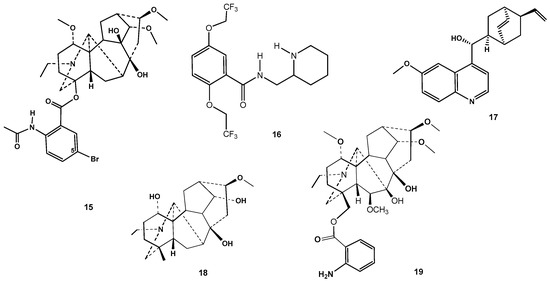Structures of 5′-bromolappaconitine 15, antiarrhythmic drug flecainide 16, alkaloid quinidine 17, and diterpenoid alkaloids karakoline 18 and anthranoyllycoctonine 19.