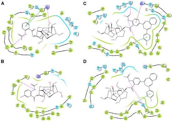 Induced fit docking results for lappaconitine 1, its derivatives 8, 10, and 15, and natural C-19 diterpenoid Aconitum alkaloids karacoline 18 [65] and anthranoyllycoctonine 19 [66] (Figure 3) are presented in Table 4.