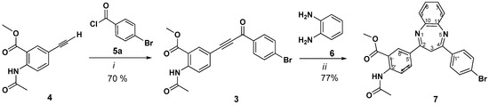 For providing the most powerful approach to compound 7, we assumed that two-step Pd-catalyzed Sonogashira coupling and subsequent Michael addition/cyclocondensation sequence could be carried out in a one-pot manner. Through the Sonogashira reaction of methyl N-acetyl-5-ethynylantranilate 4 with 4-bromobenzoyl chloride 5a in benzene for 6 h (TLC-control), evaporation of the solvent, and a subsequent reaction of the crude alkynone with o-phenylene diamine 6 in MeCN in the presence of acetic acid, compound 7 was afforded in a yield of 65% (Scheme 2).
