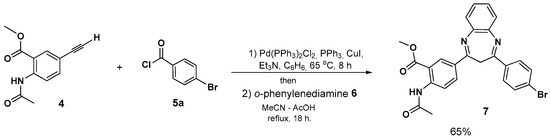 In recent years, numerous attempts have been made toward the synthesis of 1,5-benzodiazepines from available nitrogen sources, under mild reaction conditions, and more facile operational procedures, including a multicomponent reaction strategy [43,44,45]. It was known that 1,3-diarylprop-2-yn-1-ones were reactive towards cyclocondensation with binucleophiles, including benzene-1,2-diamines [43]. These processes suffer from one or other limitations, such as requiring harsh conditions, expensive reagents, low or moderate yields, relatively long reaction times, and the occurrence of several side reactions. As a model reaction for synthesis of lappaconitine-3H-1,5-benzodiazepine hybrids, which are exemplified in the present article, we studied the synthesis of 1,3-diarylprop-2-yn-1-one 3 by the acyl Sonogashira reaction of methyl 2-(N-acetylamino)-5-ethynylbenzoate 4 [46] with 4-bromobenzoyl chloride 5a, in previously described conditions [47,48], and the cyclocondensation reaction of alkynyl ketone 3 with o-phenylenediamine 6 (Scheme 1). For the last step, the choice of acetic acid has been beneficial to facilitate the cyclization step of the non-cyclic intermediate—Michael addition product. When the cyclocondensation reaction of 3 with o-phenylenediamine 6 was carried out in MeCN in the presence of acetic acid (6 equiv.) the substituted 3H-1,5-benzodiazepine 7 was obtained as the main product (yield 77%).