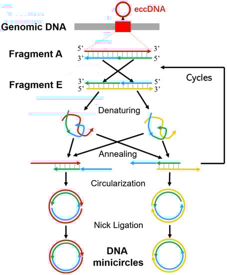 One of the reasons for this knowledge gap is the lack of efficient and robust methods for synthesizing eccDNAs/minicircles with specific sequence in vitro. Most current methods for synthesizing eccDNAs rely on chemical oligo synthesis, DNA ligation [29,31], or require a specific gene editing and recombination system [32], which are limited in the length of the eccDNAs they can produce and are usually complex, expensive, and time-consuming. For example, Ligase-Assisted Minicircle Accumulation (LAMA) has been reported to synthesize 84–106 bp minicircle DNAs [33]. It uses two double-stranded DNAs that are complementary to each other in a split-reversed manner and requires several rounds of denaturation, annealing, and ligation to synthesize eccDNAs (Figure 1). Generally, these two linear DNA fragments were amplified by PCR based on two chemically synthesized oligos. As the synthesis of long DNA oligos (>100 bp) is still relatively expensive and time-consuming, this has limited its usage in the synthesis of longer eccDNAs. Later, a nontemplated ligation method was introduced which self-ligates the DNA oligomers of Hind III cohesive ends to minicircles via T4 DNA ligase [31]. However, this ligation reaction has two limitations. Firstly, the junction sites must be a HindIII cleavage site. Secondly, very low concentrations of oligonucleotides in the range of 0.1–10 nM are required in the ligation mixture to suppress inter-molecular ligation. To achieve a high yield, a large volume of ligation mixture and a substantial amount of T4 DNA ligase are required, which in turn limits the amount of production. To overcome the limitations mentioned above, Møller et al. [32] recently reported that CRISPR-C can generate eccDNA from intergenic and genic loci in a broad range of sizes from a few hundred base pairs and ranging up to a 47.4 mega base-sized ring chromosome. This system uses CRISPR-Cas nucleases to create double-strand breaks at desired sites in the genome, which can then be repaired through non-homologous end joining (NHEJ) or microhomology-mediated end joining (MMEJ) to generate circular DNA fragments. However, this method only works in vivo and requires a specific gene editing system, which is time-consuming and complex. Therefore, the development of a quick, efficient, and robust method to synthesize eccDNAs in broad length range is urgent in the eccDNAs research field.