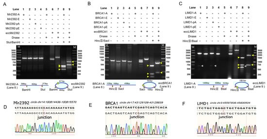 The validation of the three synthesized minicircles. (A–C). The agarose gel electrophoresis results of the intermediate/final products of QuickLAMA experiments for eccMir2392, eccBRCA1, and eccLIMD1. Lanes 1 and 2 are fragments A and E of the targeted eccDNA; lanes 3 and 4 are the phosphorylated fragments A and E; lane 5 shows the products of DNase-treated fragment A; lanes 6 and 7 are the products of the QuickLAMA assay without and with DNase treatment; lanes 8 and 9 are the products of double-restriction enzyme digestion of fragment A and DNase-treated QuickLAMA products. The patterns of double-restriction enzyme digestion in linear DNA (lane 8) and related minicircles (lane 9) are illustrated in the bottom panels. The yellow arrows indicate the fragments resulting from restriction enzyme digestion. The grey arrows in (C) indicate the unspecific bands inherited from fragment (A).(D–F). The sequencing results of the junction sites of the three minicircles. The red dashed lines indicate the junction sites.