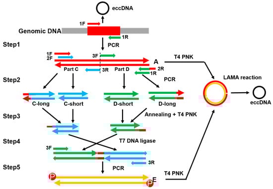 Especially, the LAMA [33] approach is widely recognized as one of the most commonly utilized methods for synthesizing eccDNAs. It assembles a minicircle from two linear double-stranded DNA fragments which are complementary to each other in two half regions with reversed directions. The two fragments were mixed in a mole-based one-to-one ratio and subjected to multiple rounds of denaturing and annealing. As a result of this process, the fragments were able to partially anneal and form long overhangs at both ends, which were then converted into minicircles with two nicks. The minicircles were obtained by ligated-catalyzed ring closure via Taq DNA ligase. However, the original paper did not outline the procedure for synthesizing these complementary fragments. Typically, subsequent studies using LAMA methods relied on chemically synthesized oligos as templates to amplify target fragments via PCR. However, this approach is limited by the length of the oligos and can be both expensive and time-consuming (Figure 1).