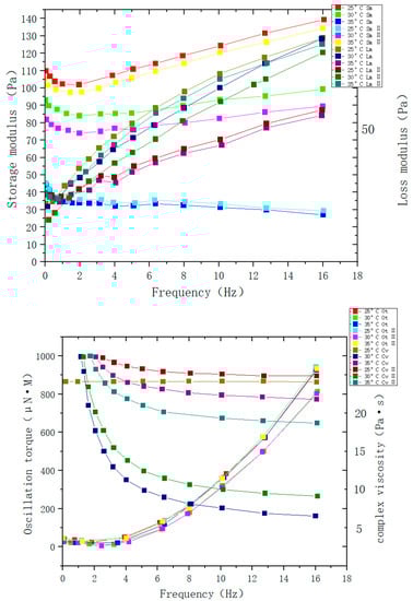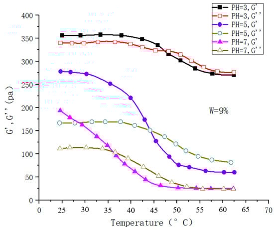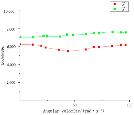 With indepth research, the dynamic covalent bond has gradually become one of the research hot points. Hou Yifan et al. [] prepared alginate hydrogel with high elasticity and pH response using polyethylene glycol dibenzoyl hydrazine and alginic acid containing some aldehyde group as raw materials through the characteristics of reversible dynamic covalent hydrazone bond. Under the conditions of hydrogel concentration of 10%, pH = 7.2 and strain of 1%, the variation curves of storage modulus (G′) and loss modulus (G″) with angular velocity (ω) were measured by rheometer (as shown in Figure 18). It can be seen from the figure that G′ > G″, G′ tends to be stable in the high-frequency region, indicating the elasticity and strength of the hydrogel are better. The multi-responsive gel has great potential value in drug delivery, organ repair, and other aspects. At the same time, the hydrogel was prepared from alginate and polyethylene glycol with excellent biocompatibility, so it is expected to be used in injectable cell engineering scaffolds and drug release intelligent materials []. Hydrogels harden and become brittle during the swelling process, and, conversely, they become soft and easy to pull. It is found that the elastic modulus of hydrogel is related by the density of molecular chains of hydrogel and the elastic energy Feι contained in each molecular chain, which is expressed as E(Φ) ≈ υ·Feι in the scalar theory.