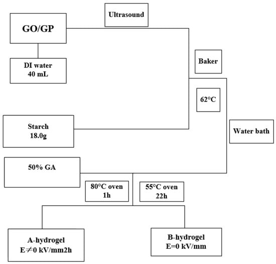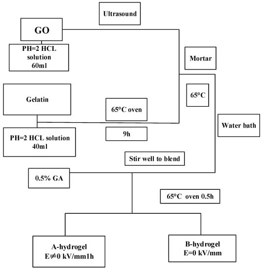 Due to its changeable structure, flexible mechanism, and controllable electronic performance, electro-responsive hydrogels can directly convert electrical energy into mechanical response, so electro-responsive hydrogels are widely used in various fields []. To increase the mechanical properties of hydrogels, improve the stability of hydrogels, prepare hydrogels with high electrical response performance, and take into account the environment-friendly characteristics, natural polymer materials that are easy to decompose [,,], non-toxic, and renewable (such as starch and gelatin) should be used more. The gel prepared by adding graphite oxide (GO) has high mechanical strength and toughness, which is suitable for the field of bioengineering [,].