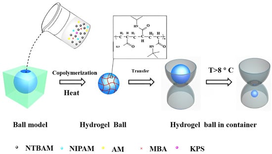 High-temperature-sensitive hydrogels have good development potential in the low-temperature ranges. Li Tang et al. [] designed, synthesized and characterized tricopolymer poly (N-tert-buty l acrylamide-co-N-isopropyl acrylamide-co-acrylamide) P (NTBAM-co-NIPAM-co-AM) hydrogel. Due to its high-temperature sensitivity (2 °C), large volume desorption (90%), and low-temperature response range (8 to 10 °C), a novel hydrogel sphere actuator was demonstrated as a temperature indicator to monitor small temperature-induced dimensional changes (as shown in Figure 4).