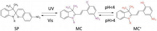 The traditional synthesis of photosensitive PEG monomer has the disadvantages of complex reaction, cumbersome post-processing, and low productivity. Traditional photosensitive gels have poor mechanical properties and compatibility. Afterwards, many synthetic photoswitch molecules were synthetized to develop new types of materials or to trigger the nanopore aperture. Among them, spiropyran (SP) is particularly interesting because its photoinduced change is not only a simple stereo isomerization but induces a modification of both its chemical structure and physical properties (as shown in Figure 7). Under visible light (VIS), the spiropyran is uncharged and not soluble in water. Under UV irradiation, spiropyran changes to a merocy anine (MC) form, which is zwitterionic and soluble in water []. These exceptional properties have been used to functionalize both inorganic and polymer material.