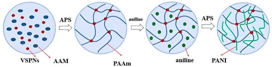 Synthesis process of conductive polyaniline/PAAM hydrogel “Reproduced with permission from Shou L., et al., Bifunctional polyaniline electroconductive hy-drogels with applications in supercapacitor and wearable strain sensors, Journal of Biomaterials Science Polymer Edition, 2020(16)” [].