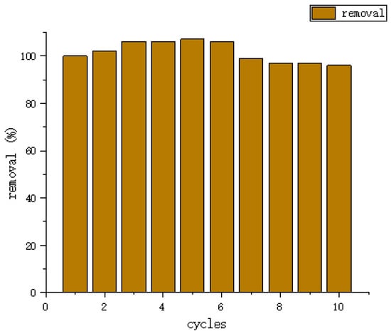 In recent years, the use of biological materials is increasing widely, and the research of cellulose-based composites has become a hot direction. Cellulose (CE) is the most abundant renewable organic material in the biosphere. Cellulose-based adsorbents have been studied in many domestic and international studied in the literature. However, among the reported cellulose-based adsorbents, most of them have low adsorption capacity and are difficult to achieve multiple recycling. Therefore, a highly efficient and multi-cycle regenerable adsorbent is yet to be investigated. Wang Zhicun et al. [] synthesized pH-responsive CE/SA composite gel by combining Cellulose with Sodium Alginate and using Epichlorohydrin as a crosslinking agent. It was found that it had a good pH response to Methylene Blue (as shown in Figure 16). When the pH value increased from 3.0 to 9.0, the MB removal rate increased from 46.04% to 98.57%; when the pH was greater than 7, the adsorption effect was the best. After 10 cycles of adsorption, the elimination rate of MB remains above 95% (as shown in Figure 17), indicating its excellent recycling reproducibility. The gel has a good effect on MB removal, low cost, and simple synthesis process, and has excellent potential in wastewater treatment and recycling [].