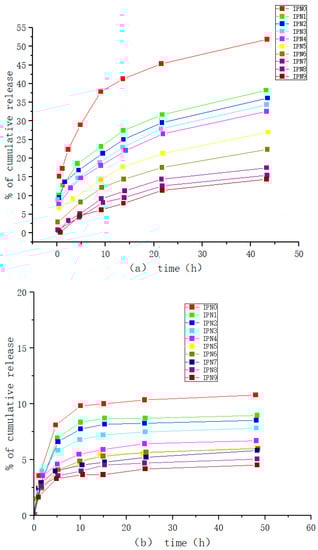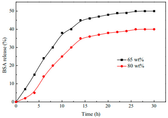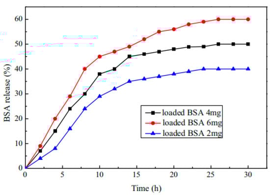 To study the factors that affect the ability to load and release drugs, Zhang Zhaofu et al. [] polymerized NIPAM with crosslinked agent Mesoporous silica nanoparticles (MSN) and initiator Potassium persulfate (KPS), and prepared PNIPA/MSN composite hydrogel with a rich honeycomb structure. MSN, as a cross-linking agent, produces double radicals after its exposure, which interact with the polyhydrocarbon resin phase and form bridge bonds between polymer molecular chains, changing them into insoluble substances with three-dimensional structures. The results showed that the Lower Critical Solution Temperature (LCST) of hydrogel samples was about 33 °C; the temperature sensitivity of compound hydrogels to BSA (bovine serum albumin), egg white lysozyme, and collagen oligopeptides with large, medium, and small molecular weights was similar, and the drug release could be controlled by temperature regulation; The hemolysis test showed that its biocompatibility was excellent. Therefore, PNIPA/MSN composite hydrogel can be used as a temperature-sensitive drug-controlled release carrier.