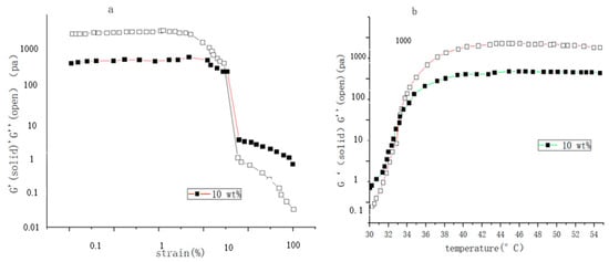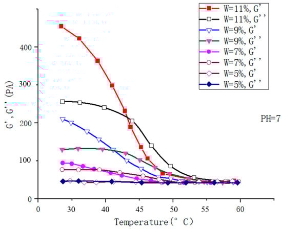 Tanaka et al. [] found that the volume transformation temperature of P-N-isopropylacrylamide (PNIPAM) was about 32 °C. Destroying the balance between hydrophilic and hydrophobic groups in the macromolecular chain of PNIPAM, causes the polymer to release water from the hydrophobic interface, resulting in polymer precipitation []. It is easy to control, easy to modify, and has other excellent properties, and it has become the most popular type of temperature-sensitive gel studied at present.