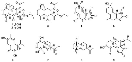- Shu, W.; Jian, S.; Ke, Z.; Chen, X.Q.; Zheng, M.B.; Jian, Y.; Tang, P.F. Sesquiter-penes from Artemisia argyi: Absolute Configurations and Biological Activities. Eur. J. Org. Chem. 2014, 5, 973–983. [Google Scholar]