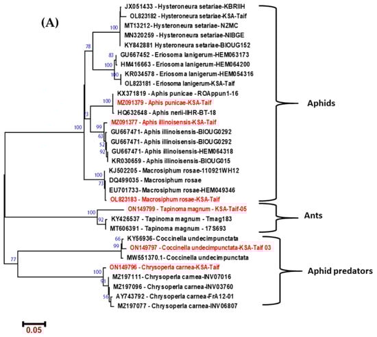 Aphids were collected from different plant hosts including pomegranate, grapes and Taif roses. Aphid predators such as the ladybird C. undecimpunctata, lacewing larvae C. carnea, and ant T. magnum were collected from different sites located in Taif, Saudi Arabia. The samples were collected from May to September of 2021 (Table 5). For molecular identification of the collected insects, DNA extraction was accomplished using the QIAamp® DNA Mini Kit (QIAGEN, Hilden, Germany) as described elsewhere [92]. The mitochondrial cytochrome oxidase gene (COI) was amplified with PCR, using the primer set (LCO1490) (F-5′-GGTCAACAAATCATAAAGATATTGG-3′) and (R HCO2) (R-5′-TAAACTTCAGGGTGACCAAAAAATCA-3′) [93]. The PCR reaction was performed as described in our previous study [92]. PCR products were visualized on 1.5% agarose gel using the BDA gel documentation system (Biometra, Göttingen, Germany). PCR products corresponding to the size of the amplified COI gene were retrieved from the gel, and DNA sequencing was performed on both strands using a 3130xl Genetic Analyzer (Biosystems; Thermo Fisher Scientific, Waltham, MA, USA). The raw sequence data were edited and assembled using Bio-edit software, version 7.2.5 (Ibis Biosciences, Carlsbad, CA, USA) and the Edit Seq program of the Lasergene software package, version 3.18 (DNA Star, Madison, WI, USA). The BLAST tool was used to identify the assembled sequences [94]. The assembled sequences were deposited in GenBank with the following accession numbers (aphids: MZ091377, MZ091379, and OL823183; aphid predators: ON149796, ON149797 and ant: ON149799).
