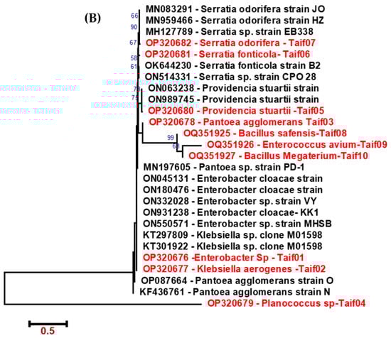 DNA was extracted individually from isolated bacteria using a DNeasy® Blood and Tissue kit (QIAGEN) kit, following the manufacturer’s instructions. The V3 and V4 regions of the 16S rRNA gene was amplified using the following primer sets: Bakt_341F (CCTACGGGNGGCWGCAG), and Bakt_805R (GACTACHVGGGTATCTAATCC) [95]. The PCR reaction mixture contained 4 μL of FIREPol® Ready to Load Master Mix (SolIS BioDyne, Tartu, Estonia), 0.6 μL of each primer, 2 μL of isolated DNA, and water to bring the total volume to 20 µL. The PCR reaction conditions were initial denaturation at 95 °C for 5 min, followed by 30 cycles of denaturation at 95 °C for 40 s, annealing at 55 °C for 2 min and extension at 72 °C for 1 min and a final extension step at 72 °C for 7 min. The resultant PCR products were analyzed on 1.5% agarose gels and visualized using the BDA gel documentation system (Biometra, Göttingen, Germany). PCR bands corresponding to the 16S rRNA gene were excised from the gel and purified using Illustra GFX PCR DNA and a gel band purification kit (GE Healthcare). DNA sequencing was accomplished using 3130xl Genetic Analyzer (Biosystems; Thermo Fisher Scientific, Waltham, MA, USA). The raw sequence data were edited and assembled using Bioedit software, version 7.2.5 (Ibis Biosciences, Carlsbad, CA, USA), and the EditSeq program of the Lasergene software package, version 3.18 (DNAStar, Madison, WI, USA). Identification of bacterial isolates was achieved using the BLAST tool [94] and the 16S rRNA gene sequences genes were deposited in GenBank with the following accession numbers (OP320676–OP320682, OQ351925–OQ351927), as shown in Table 5.