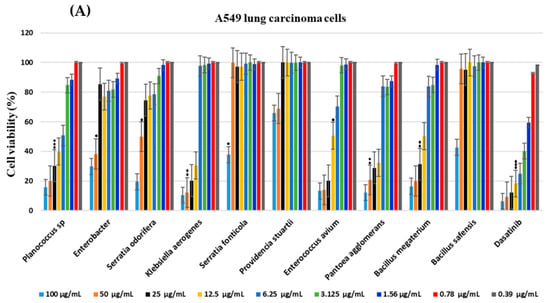 The biological activity of the bacterial EA-ME against two types of cancer cell lines, adenocarcinoma human alveolar epithelial cells (A549), and human colon carcinoma (hct116), were tested in vitro using a 3-(4,5-Dimethylthiazol-2-yl)-2,5-Diphenyltetrazolium Bromide (MTT) colorimetric assay. The cells were maintained in Dulbecco’s Modified Eagle’s Medium (DMEM) supplemented with 10% fetal bovine serum, 2 mM L-glutamine, and 1% penicillin/streptomycin. The test was performed in 96-well plates, and the cells (5 × 104 cells/mL) were seeded into the assigned wells and were incubated overnight at 37 °C, 5% CO2, and 99% humidity. Two-fold serial dilutions of the EA-ME, starting from 100 μg/mL down to 0.39 μg/mL, were prepared in DMEM and added to the assigned wells. Control wells received ethyl acetate only and the plates were incubated for four days. The MTT was added to the cells, and the plates were incubated under growth conditions for two hours. The medium was then removed, and the cells were washed two times in phosphate-buffered saline (PBS). The formed formazan crystals were dissolved in Isopropanol. The cytotoxic activity of the anticancer drug dasatinib against the two cell lines A549 and Hct116 was used as a positive control for comparative purposes. The compound was diluted to the same concentrations of the tested extracts. The experiment was performed in triplicate for each concentration, the absorbance was measured at 595 nm and the average values obtained were considered. The following formula was used to calculate cell viability (Equation (1)) [101]: