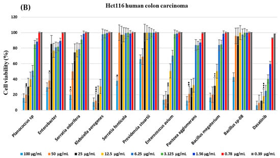 MTT cytotoxic activity assay of insect endosymbiotic bacterial EA-ME tested at different concentrations from 100 µg/mL to 0.39 µg/mL on (A) A549 lung carcinoma cells and (B) Hct116 human colon carcinoma cells. Bars represent means ± standard deviations (SD) measured for each concentration (n = 3). The statistical significance of the IC50 values of different extracts and the positive control, dasatinib, were calculated using an unpaired Student’s t-test, where (●) p < 0.05, (●●) p < 0.01 and (●●●) p < 0.001.