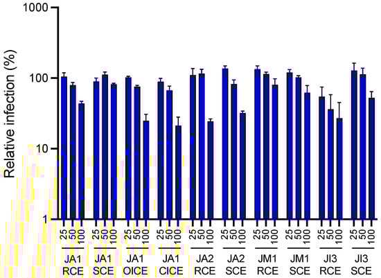 A primary screening based on the use of a luciferase recombinant HCoV-229E (HCoV-229E-Luc) was carried out on the crude methanolic extracts of rhizomes, stems and inflorescences of the collected Juncus species (Juncus acutus L., Juncus inflexus L. and Juncus maritimus Lam.) in order to identify the most active extract(s) against HCoV-229E. Infection was performed in Huh-7 cells expressing the transmembrane serine protease 2 (TMPRSS2). TMPRSS2 is a key enzyme in HCoV-229E and SARS-CoV-2 entry as it allows the fusion of the viral particle to the cell membrane, which is the major entry pathway for coronaviruses [,,]. In the absence of TMPRSS2, the virus enters the cell via endocytosis and fusion with the endosomal membrane. Among all crude methanolic extracts tested at 100 µg·mL−1 (Figure 1), the highest antiviral activities against HCoV-229E-Luc were respectively observed for J. acutus closed inflorescences (locality 1) = JA1 CICE, J. acutus rhizomes (locality 2) = JA2 RCE, J. acutus open inflorescences (locality 1) = JA1 OICE, J. acutus stems (locality 2) = JA2 SCE, and finally for J. inflexus rhizomes (locality 3) = JI3 RCE. The activity of these five crude extracts was quite similar.