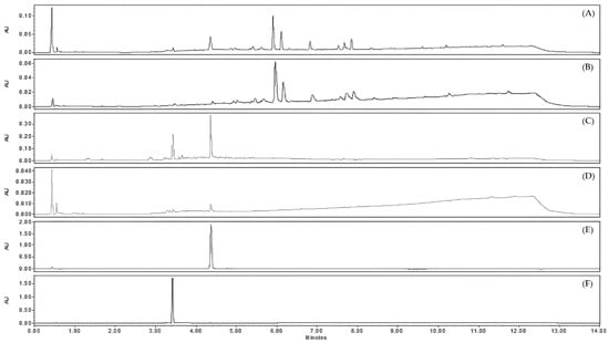 Chromatograms obtained by UHPLC-UV-MS at λ = 254 nm of different extracts of J. acutus stems (JA2) (A) crude methanolic extract, (B) CH2Cl2 sub-extract, (C) EtOAc sub-extract, (D) aqueous sub-extract; as well as reference standards (E) luteolin, (F) luteolin-7-O-glucoside.
