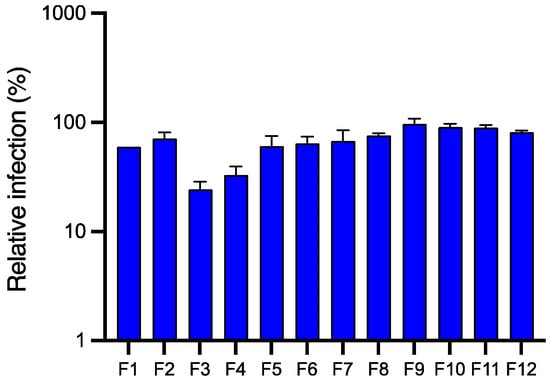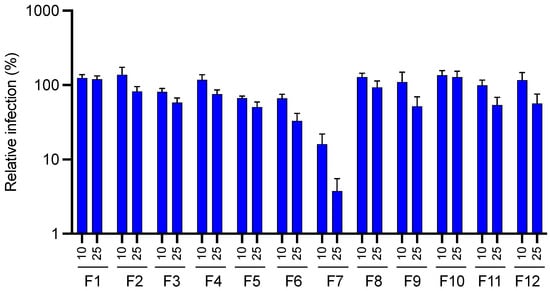 Our results (Figure 4) clearly demonstrated that fraction F7 showed the most remarkable antiviral activity compared to the rest of the tested fractions, with a reduction of approximatively 2 log10 of the relative luciferase activity at 10 µg·mL−1.