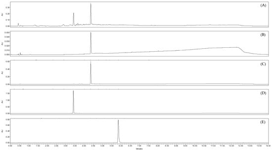 Chromatograms acquired by UHPLC-UV-MS at λ = 254 nm of (A) EtOAc sub-extract of J. acutus stems (JA2), (B) the active pre-purified fraction F7 obtained by semi-preparative HPLC from the same sub-extract, and reference standards (C) luteolin, (D) luteolin-7-O-glucoside and (E) juncusol (at λ = 280 nm).