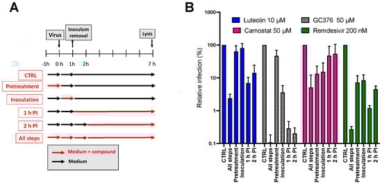 Luteolin is active at the replication step. (A) Schematic representation of the time of addition assay; (B) Huh-7/TMPRSS2 cells were inoculated with HCoV-229E-Luc. Luteolin (10 µM), GC376 (50 µM), camostat (50 µM) and remdesivir (200 nM) were added at different time points either before, during or post-inoculation (1 h or 2 h post-inoculation). Cells were lysed 7 h post-inoculation and luciferase activity was quantified. Results were expressed relative to the control without compound for which a value of 100 was attributed. Results are means ± SEM of 3 experiments performed in triplicate.