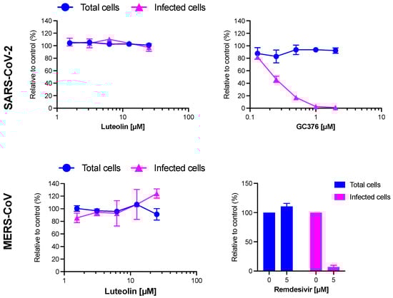 Luteolin is not active against SARS-CoV-2 and MERS-CoV. Vero81-derived F1G-red cells and Calu-3 cells were inoculated with SARS-CoV-2 and MERS-CoV (MOI 0.2), respectively, in the presence of increasing concentrations of luteolin or control compounds (GC376 and remdesivir for SARS-CoV-2 and MERS-CoV, respectively). For SARS-CoV-2 infection in F1Gred cells, infected cells and total cell numbers were recorded and quantified 16 h post-inoculation as previously described (Desmarets et al., 2022). For MERS-CoV infection in Calu-3 cells, cells were fixed with 4% PFA 16 h post-inoculation and immunofluorescence staining was performed against dsRNA. Nuclei were visualized with DAPI. Images were obtained with an EVOS M5000 imaging system and percentage of infected cells and total cell numbers were quantified with the Image J software version 1.5i. Data are presented as percentage of infection relative to the DMSO controls. Data are means ± SEM of 2 independent experiments performed in triplicates.