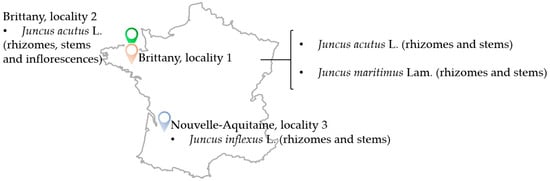 Three Juncus species were collected in 2 regions in France, Brittany (2 different localities: 1 and 2) and Nouvelle-Aquitaine (locality 3) during July 2018 (Table 1 and Figure 12). Botanical identification was performed by Drs. Gabriel Lefèvre and Céline Rivière and a voucher specimen for each plant was deposited at the laboratory of Pharmacognosy, University of Lille, France.