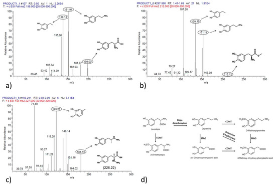 Spectral data and fragment analysis of L-DOPA (panel (a)), LDME (panel (b)), and carbidopa (panel (c)). Panel (d) shows L-DOPA metabolism and enzymes involved in sequential transformation (catechol-O-methyltransferase COMT; monoamine oxidases (MAO).