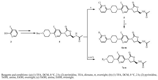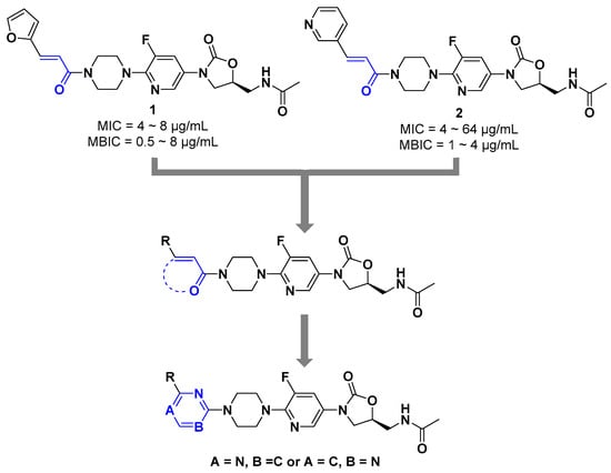 Our research group previously modified the structure of linezolid (Figure 1) [,,,,], found that compounds 1 and 2 have efficient antibacterial activity for S. aureus, Streptococcus pneumoniae, Enterococcus faecalis, etc. (MICs = 4~64 µg/mL) and exciting antibiofilm activity (MBIC = 0.5~8 µg/mL). The vinyl structure in these molecules is retained and cyclized to form a new aromatic heterocyclic ring. Considering the unique electronegativity of pyrimidines and their ability to form hydrogen bonds [], pyrimidine aromatic rings were introduced into the structure []. Accordingly, a series of 3-(5-fluoropyridine-3-yl)-2-oxazolidinone derivatives were synthesized and tested for antibacterial activity (Figure 2).