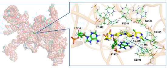 Docking results for 7j with the 50S ribosomal subunit from Haloarcula Marismortui (PDB ID: 3CPW). The O atom (red), the N atom (blue), and the C atom (yellow) are shown. Hydrogen bonds are shown as dashed green lines.