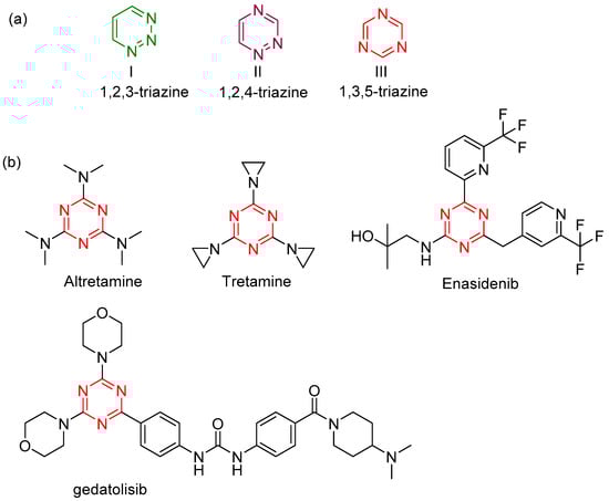 Triazines are an important class of heterocyclic compounds. The triazine structure is a heterocyclic, six-membered benzene ring with three carbons replaced by nitrogens. The isomers of triazine (Figure 1a) are distinguished from each other by the positions of their nitrogen atoms and are called 1,2,3-triazine (I), 1,2,4-triazine (II), and 1,3,5-triazine. 1,3,5-triazine, also called s-triazine, has three easily modified sites at positions 2, 4, and 6, usually used for modulating its physicochemical and biological activities. s-Triazine scaffold provides the source for the design of biologically relevant molecules with well-known applications, such as antibacterial, anticancer, and anti-inflammatory [,]. s-triazine derivatives have attracted attention due to their remarkable activity against a wide range of cancer cells. As shown in Figure 1b, hexalen [], also called altretamine, is an example of an antineoplastic drug based on an s-triazine-privileged structure that was first approved by the FDA in 1990 for the treatment of refractory ovarian cancer. After that, various anticancer drugs containing the s-triazine motif were approved, such as tretamine, gedatolisib, and enasidenib. Current studies investigating s-triazine candidates with great promise for antitumor activity focus on different protein kinases, such as topoisomerases, tyrosine kinases, phosphoinositide 3-kinases (PI3K), NADP+-dependent isocitrate dehydrogenases (IDH), and cyclin-dependent kinases (CDK).