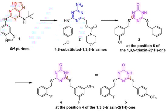 The Novartis research group reported a kind of ATP-competitive catalytic topoisomerase II inhibitor 1 with the core 9H-purine scaffold in 2009 [], as shown in Figure 2. Then the 9H-purine motif of the compounds was monocyclically substituted by 1,3,5-triazines, which was first reported [] by Perdih et al. using a virtual screening protocol. In the hit selection, 4-amino-6-(phenylamino)-1,3,5-triazines 2 displayed potent topoisomerase IIa inhibitory activity with IC50 values in the micromolar range (IC50 = 229 µM). Moreover, compound 2 exhibited cytotoxicity against the HepG2 cell lines (IC50 = 20.53 µM), MCF-7 (IC50 = 129.0 µM), and normal HUVEC cells (IC50 = 122 µM). Furthermore, Perdih et al. designed a series of 4,6-disubstituted-1,3,5-triazin-2(1H)-one analogs []. This research provided valuable structure-activity relationship (SAR) data regarding the role of substituents introduced at position 6 of the 1,3,5-triazin-2(1H)-one core. Among which, 6-(benzylthio)-4-((3-chlorobenzyl)thio)-1,3,5-triazin-2(1H)-one 3 was identified as a topoisomerase II inhibitor with an improved IC50 of 57.6 µM. However, these compounds showed low cytotoxicity in cancer cells. Perdih et al. further optimize the substituents at position 4 of the 1,3,5-triazin-2(1H)-one scaffold to improve the inhibition potency that would display activity on the cellular level. After virtual screening and experimental evaluation for human topo IIa inhibition, the most potent compounds were 4 and 5, with IC50 values of 8.1 µM and 11.1 µM, respectively, as well as being superior to the positive drug etoposide (IC50 = 28.6 µM) []. Additionally, compound 5 showed better HepG2 cell inhibitory activity with EC50 values of 38.7 µM.