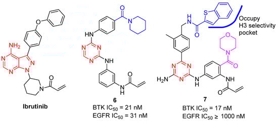 Xiang et al. designed a kind of novel covalent BTK inhibitor by substituting the 1H-pyrazolo[3,4-d] pyrimidine core (Ibrutinib) with a 1,3,5-trazines scaffold containing a key acrylamide warhead, as shown in Figure 3. As reported, compound 6 showed potent BTK inhibitory activity (BTK IC50 = 21 nM), validating the potential of the 1,3,5-trazine scaffold as a new skeleton for developing effective BTK inhibitors []. However, 6 also potently inhibited EGFR with an IC50 value of 31 nM. In order to improve its selectivity for BTK over EGFR, the 1,3,5-triazine scaffold modified by more hydrophobic side chains, which would additionally occupy the H3 pocket of BTK, was designed. Structure-activity relationship (SAR) and extensive pharmacological screening led to the discovery of a potent irreversible BTK inhibitor 7 []. Compound 7 possessed desirable BTK selectivity (IC50 = 17.0 nM) over EGFR (IC50 > 1000 nM) and JAK3 (IC50 = 104.6 nM), which shared a high degree of homology with BTK. However, it is worth noting that broad kinase panel screening is further needed to clarify the selectivity profile of 7.