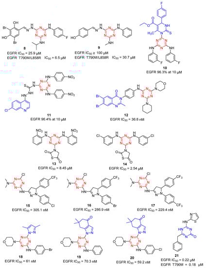 EGFR signaling dysregulation in tumors could result in EGFR overexpression or a gain-of-function mutation. According to the reports, acquired drug resistance to the first-generation EGFR-TKIs was revealed due to the T790M and L858R mutations in EGFR. Although a drug related to EGFRT790M or EGFRT790M/L858R mutation has been discovered, it is still needed to discover new EGFR inhibitors with high selectivity for EGFRT790M and EGFRT790M/L858R kinases. Azmy et al. reported a series of 1,3,5-triazine-based derivatives as potential EGFRWT and EGFRT790M inhibitors []. Among the derivatives, compound 21 as the most potent antiproliferative agent showed inhibitory activity with EGFRWT (0.22 ± 0.05 µM) and EGFRT790M (0.18 ± 0.11 µM), compared to the reference drugs erlotinib (0.09 ± 0.05 µM) and AZD9291 (0.55 ± 0.10 µM).