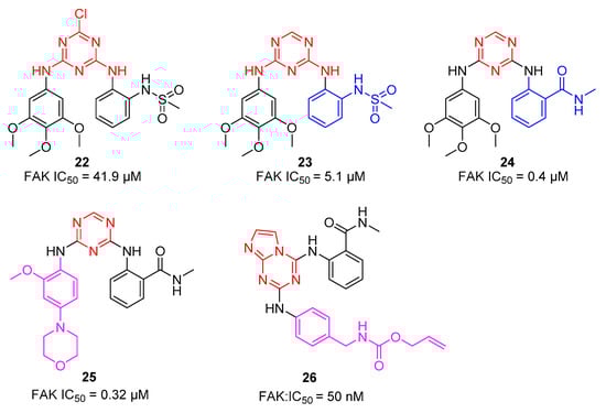 In 2013, Chen and co-workers reported a series of diarylamino-1,3,5-triazine derivatives as FAK inhibitors []. As shown in Figure 5, compound 22 showed poor activity against FAK (IC50 = 41.9 µM) owing to the introduction of a 3,4,5-trimethoxyanilino group and a methanesulfonamide phenyl group on the 1,3,5-triazine ring. Then, they removed the chlorine atom from 22, and compound 23 with good inhibitory activity against FAK (IC50 = 5.1 µM) was obtained. Moreover, they found that when the methanesulfonamide phenyl group was displaced with an amide moiety, compound 24 showed significantly increased inhibitory activity against FAK (IC50 = 0.4 µM). While changes in the 3,4,5-trimethoxyanilino group of compounds 24 and 25 exhibited similar inhibitory activity against FAK (IC50 = 0.31 µM), in order to improve the FAK kinase activity, they continued to design imidazo[1,2-a][1,3,5] triazines as novel FAK inhibitors in 2015 []. The new compounds displayed 10–100 nM IC50 values against FAK, and compound 26 (IC50 = 50 nM) was identified as the best inhibitor.