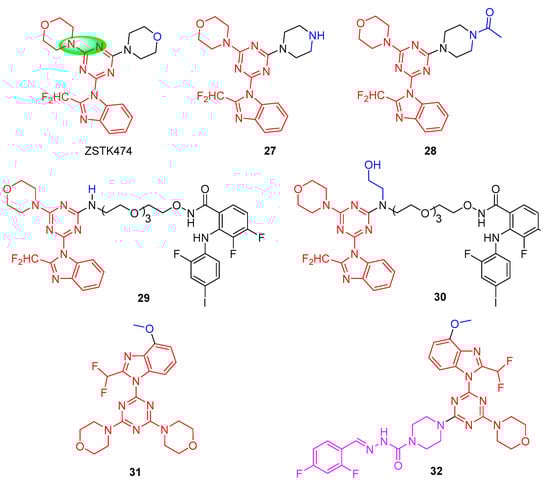 As shown in Figure 6, D. Ross et al., using ZSTK474 as a lead compound, explored compound 27 by displacing a single morpholine group in ZSTK474 with piperazine. Compound 27 showed a 36-fold reduction in its PI3Kα (IC50 = 180 nM) and PI3Kδ (IC50 = 142 nM) inhibition and a >70-fold reduction in PI3Kβ (IC50 = 1093 nM) and PI3Kγ (IC50 = 1873 nM) inhibition, indicating the sensitivity of this region towards oxygen replacement []. However, N-acetylation of 27 to provide 28 showed PI3K isoform inhibition (IC50 = 2.9−21 nM) similar to ZSTK474 (IC50 = 3.9−20.8 nM). To further investigate the role of the morpholine oxygen in these compounds on PI3K inhibition, they found that when the 2-aminoethyl functional groups were displaced with a single morpholine group of ZSTK474 [], bifunctional inhibitors 29 and 30 displayed nanomolar inhibition towards PI3Kα (IC50 = 130 nM and 107 nM, respectively) and PI3Kδ (IC50 = 236 nM and 137 nM, respectively) and low micromolar inhibition for PI3Kβ and PI3Kγ (IC50 = 1.5−3.9 µM) in enzymatic inhibition assays. Cell viability assays demonstrated that compound 29 showed superior anti-proliferative activities over compound 30 in three tumor-derived cell lines (A375, D54, and SET-2), owing to 29 being able to inhibit downstream AKT and ERK1/2 phosphorylation.