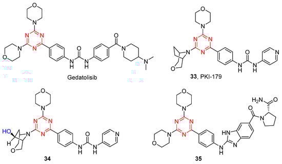 The Venkatesan group has reported the bis-morpholino s-triazine-based compounds as potent dual PI3K/mTOR inhibitors []. Gedatolisib was found to have poor plasma levels when administered orally, which may owe to its poor permeability, low clogP (1.24), and high molecular weight (Mw: 615). In order to increase the clogP value and reduce molecular weight, Mansour et al. reported a series of mono-morpholino 1,3,5-triazine derivatives by a single morpholine group in gedatolisib that were replaced with 3-oxa-8-azabicyclo[3.2.1]octane []. As shown in Figure 7, 33 showed significantly increased potency against PI3Kα (IC50 = 8 nM) and mTOR (IC50 = 0.42 nM) and excellent cellular potency against both MDA-361 (IC50 = 22 nM) and PC3mm2 (IC50 = 29 nM) cell lines. Pharmacokinetic studies of 33 showed good oral bioavailability in nude mice after oral administration (10 mg/kg) and a high half-life (>60 min). Metabolite evaluation studies found that the ethylene bridge on the bridged-morpholine group was the main site of metabolism, and its metabolite structure was determined to be 34 []. Therefore, compound 33 is an orally effective dual PI3K/mTOR inhibitor.