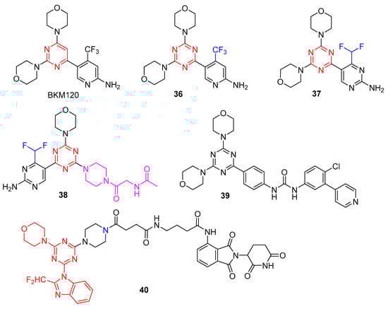 BKM120 is one of the clinically most advanced pan-PI3K inhibitors, but it interferes with an off-target effect on microtubule polymerization. As shown in Figure 8, Wymann et al. have identified that it differs from BKM120 by having only one atom that could be separated into discrete PI3K and tubulin activities []. Initially inspired by ZSTK474 and BKM120, they replaced the BKM120 core with s-triazine to yield bimiralisib (36), aiming to maximize compound solubility and bioavailability and avoid microtubule interactions. As expected, 36 displayed potent inhibition against pan-PI3K and showed no microtubule-destabilizing agent activity []. Above all, 36 is a highly selective pan-PI3K inhibitor with balanced targeting of mTOR kinase, which passed phase I studies and is now in phase II studies in relapsed and refractory lymphoma and advanced solid tumors [,].