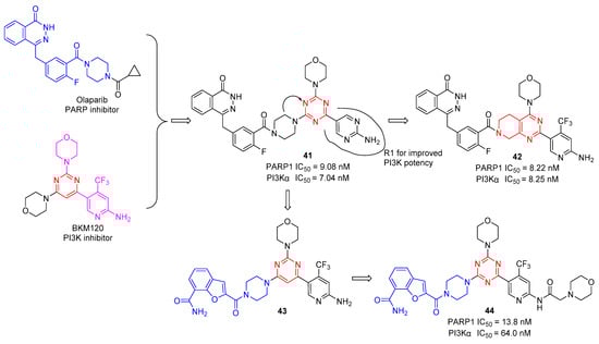 In 2012, Baselga and Wulf’s groups independently found that PI3K inhibition could promote HR deficiency by downregulating BRCA1/2 and could sensitize BRCA-proficient tumors to PARP inhibition, which provides an effective therapy for the combined administration of PI3K and PARP inhibitors to expand the application of PARP inhibitors [,]. Based on these works, Xu et al. reported a series of dual PARP/PI3K inhibitors by merging the pharmacophores of PARP and PI3K inhibitors []. As shown in Figure 9, structure−activity relationships (SARs) indicate that the R1 group, which serves as a hydrogen-bond donor, could be modified to change the compounds’ PI3K inhibitory activity. Several compounds were synthesized and evaluated for PARP-1 and PI3Kα inhibitory activities. As expected, all the remaining compounds showed excellent PARP-1 inhibitory activity in the low nanomolar range. The first round of structural optimization provided compound 41, which displayed appropriate PARP-1 and PI3Kα inhibitory activities with IC50 values of 9.08 and 7.04 nM, respectively. Subsequently, to further optimize the 1,3,5-triazine core by a bicyclic system of tetrahydropyrido[3,4-d]pyrimidine, compound 42 displayed the most promising candidate with IC50 values of 8.22 and 8.25 nM against PARP-1 and PI3Kα. Next, they replaced the phthalazine moiety with a benzofuran-7-carboxamide moiety to obtain compound 43, which exhibited good PARP-1 and PI3Ka inhibitory activity with an inhibition ratio of more than 50% at 10 nM and 100 nM, respectively. After SAR screening and experimental evaluation, the most potent compound was 44 against PARP-1 and PI3Kα with IC50 values of 13.8 and 64.0 nM, respectively [].