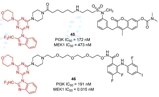 The Ras/MEK/ERK and PI3K/Akt/mTOR pathways play important biological functions. MEK inhibition could promote a compensatory activation of PI3K/Akt kinase activity. As shown in Figure 10, Ross et al. reported a s-triazine analog 45 by combining the PI3K inhibitor ZSTK474 with the Raf/MEK inhibitor RO5126766. Bifunctional inhibitor 45 showed good inhibitory activity against MEK1 (IC50 = 473 nM) and PI3K (IC50 = 172 nM) []. However, the corresponding inhibition of pERK1/2 activity was low (35−40%) in two representative human cancer cell lines (A549, PANC-1) at the 5 μM concentration level. Recently, they continued to report a series of bifunctional MEK1/PI3K inhibitors by covalent linking the PI3K inhibitor ZSTK474 and the MEK inhibitor PD0325901 []. Among them, compound 46 showed excellent inhibition against MEK1 (IC50 = 0.015 nM) and PI3K (IC50 = 191 nM) and displayed a 95% and 67% inhibition of tumor ERK1/2 and Akt phosphorylation, respectively, at 2 h postadministration.
