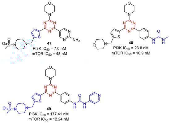 Zhu and co-workers reported 2-(thiophen-2-yl)-1,3,5-triazine derivatives 47 as PI3K and mTOR inhibitors in 2020 []. By experimental screening, as shown in Figure 11, compound 47 showed excellent inhibition activity of cell proliferation against A549, MCF-7, and Hela cancer cell lines with IC50 values of 0.20 ± 0.05 µM, 1.25 ± 0.11 µM, and 1.03 ± 0.24 µM, and potently inhibited PI3K and mTOR kinases with IC50 values of 7.0 and 48 nM, respectively. Further, they also reported the 2-arylurea-1,3,5-triazine derivative 48 as a PI3K and mTOR inhibitor []. Compound 48 exhibited potent inhibition against PI3K and mTOR kinases with IC50 values of 23.8 and 10.9 nM, respectively. Compound 48 was further evaluated in MCF-7 cells and MCF-7 xenograft models, which showed significant in vitro and in vivo anticancer efficacies. Besides, in order to enhance the mTOR kinase activity, they introduced aryl urea units with various substituents into the triazine core and modified it with arylurea by pyridine to obtain a series of novel thiophene-triazine derivatives bearing arylurea []. Among them, the inhibitory activity of 49 against PI3Kα and mTOR kinase was excellent, with IC50 values of 177.41 and 12.24 nM, respectively, indicating that it was a potential dual PI3Kα/mTOR inhibitor.