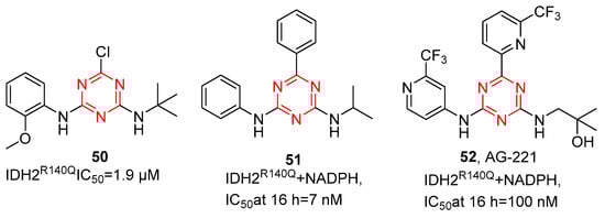 Metabolic reprogramming is a hallmark of cancer, promoting the initiation and maintenance of tumors. The NADP+-dependent isocitrate dehydrogenases (IDH) are critical metabolic enzymes, converting isocitrate to α-ketoglutarate (αKG) in the tricarboxylic acid cycle. IDH mutations occur in multiple tumors, mainly in IDH1 (R132) and IDH2 (R140 and R172). In recent years, several IDH inhibitors have been approved by the FDA. Among them, AG-221 (enasidenib) is a first-in-class, orally available, small-molecule s-triazine IDH2 inhibitor []. Through high-throughput screening, as shown in Figure 12, Su et al. [] reported several s-triazine compounds as effective inhibitors against IDH2R140Q, and the initial hit compound 50 was obtained. Compound 50 showed micromolar inhibitory potency for IDH2R140Q with IC50 values of 1.9 µM. SAR analysis among the s-triazine analogs obtained compound 51, the first nanomolar inhibitor of IDH2R140Q (IC50 = 7 nM at 16 h). Although compound 51 showed potency in enzymatic and cellular assays, 51 displayed high lipophilicity, resulting in solubility-limited absorption in vivo. Additionally, it emerged poor in vitro liver microsomal stability, which translated to high clearance in vivo. Thus, they continue optimizing the substituents around the s-triazine core. Through the addition of mildly polar substituents with trifluoromethyl pyridine and 2-methyl-2-propanol to provide 52, AG-221(52) showed excellent potency for 2HG inhibition, improved solubility, low clearance, and good oral bioavailability in vivo in rats, supporting the clinical trials of AG-221 in patients with IDH2 mutation.