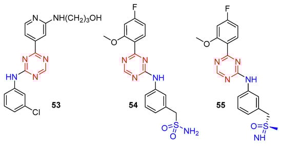 Cyclin-dependent kinases (CDKs) are members of a complex family of heterodimeric serine/threonine protein kinases that play an important role in regulating cell cycle machinery. Depending on their biological functions, CDKs can be divided into cell cycle regulatory CDKs (CDK1, CDK2, CDK4, and CDK6 are included) and transcription-associated CDKs (CDK7−9, CDK11−13, and CDK19 are included) []. Murray et al. have identified [1,3,5]triazine-pyridine as a new series of potent CDK inhibitors []. Among them, compound 53 (Figure 13) displayed excellent inhibitory potency at CDK1 (IC50 = 0.021 µM), CDK2 (IC50 = 0.007 µM), and CDK5 (IC50 = 0.003 µM) and submicromolar potency at CDK4 (IC50 = 0.308 µM), CDK6 (IC50 = 0.356 µM), and CDK7 (IC50 = 0.126 µM). The broad spectrum of potent CDK inhibitory activities and the in vitro and in vivo antitumor efficacy of 53 may render it as a valuable pharmacological tool in elucidating the complex roles of CDK signaling pathways.