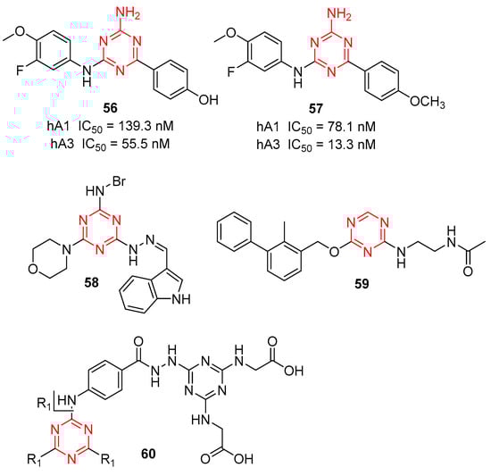 Human adenosine receptors (hARs) can be classified into four subtypes: hA1, hA2A, hA2B, and hA3. All four belong to the G protein-coupled receptor (GPCR) family, and each has a different pharmacological profile, tissue distribution, and function. Langmead et al., in an effort to find a novel hit by virtual screening, reported several compounds containing 1,3,5-triazine that bind to hA1 and hA2A. Subsequently, 1,3,5-triazine analogs were identified as potent human adenosine receptor antagonists for Parkinson’s disease [,]. To modify s-triazine to produce selective ligands for subtypes other than hA2A. Yu et al. designed and synthesized novel 1,3,5-triazine derivatives targeting the hA1 and hA3 adenosine receptors for cancer therapy []. As shown in Figure 14, compounds 56 and 57 showed good binding affinity to both hA1 (IC50 = 139.3 nM, 78.1 nM, respectively) and hA3 AR (IC50 = 55.5 nM, 13.3 nM, respectively) and could inhibit cell viability, leading to cell death in lung cancer cell lines.