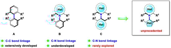 Representative axially chiral skeletons bearing a C–C or C–N axis. (A): C–C axially chiral skeletons; (B): C–N axially chiral skeletons; (C): C–N bi-heterocyclic axially chiral skeletons. Het: heterocyclic ring.