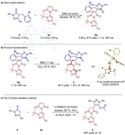 To demonstrate the scalability of this protocol, we conducted a gram-scale reaction of pyrazolone 1i with pyrazolyl–maleimide 2a under the standard reaction conditions, and the product 3ia was successfully obtained in a 91% yield with 1:1 dr and 96% ee (Scheme 5a). Subsequently, the selective bromination of compound 3ia in the presence of NBS proceeded smoothly, producing the product 4 in a 58% yield, >20:1 dr and 96% ee. The excellent diastereoselective results revealed that the bromination at the C-4 position of the pyrazole ring played an important role in controlling the stereoselectivity of the reaction. The N-1 and C-4 positions of the pyrazole ring were substituted with tert-butyl and bromine, respectively, and their large steric hindrance effect successfully achieved good stereoselective control of the C–N axis (Scheme 5b). In order to further prove the existence of the C–N axis in the target products, a Michael reaction of 4-nonsubstituted pyrazolone 5 and pyrazolyl–maleimide 2a was performed under similar reaction conditions, followed by esterification using acetic anhydride to produce the compound 6 in a 60% yield with 6:1 dr. This diastereomeric ratio indicated that the product 6 contained two chiral elements, namely center chirality and axial chirality (Scheme 5c).
