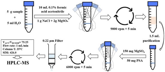 Here, 1.5 mL of the upper clear supernatant was added to a 2.5 mL centrifuge tube (containing 150 mg MgSO4 + 50 mg PSA). These were vortexed for 1 min, centrifuged at 6000× g rpm for 5 min, and passed through a 0.22 μm sterile filter for it to be tested by HPLC-MS.